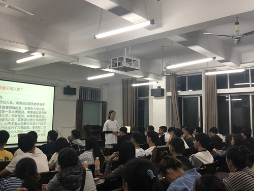 学生党员周美同学跟大家分享了主题为“做新时代追梦人”学习心得,并向2019级同学介绍了入党流程和要求。