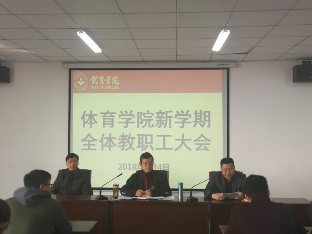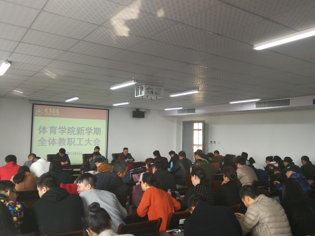 院党委书记付和忠传达了3月3日下午学校新学期领导干部会议精神,并重点传达了刘晓东校长在会上的讲话精神及工作部署。他要求全体教师切实增强安全意识,认真排查教学训练、运动竞赛、群体活动、学生管理中的安全隐患,自觉维护学院的安全稳定;增强学习意识,加强政治理论和业务学习,自觉提高政治素养、教学水平和科研能力。