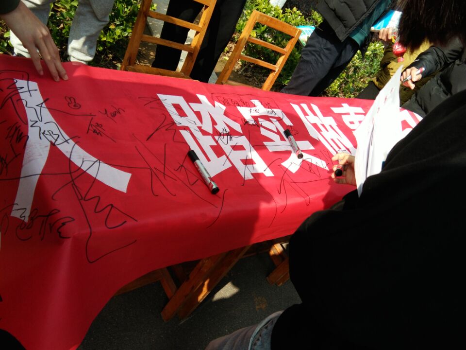 本次活动的宗旨“诚信做人,踏实做事,诚信考试,远离舞弊”为主题。同学们纷纷踊跃地在横幅上签下自己的名字以示对本次活动的支持,也是对诚信考试的自我约束和认同。