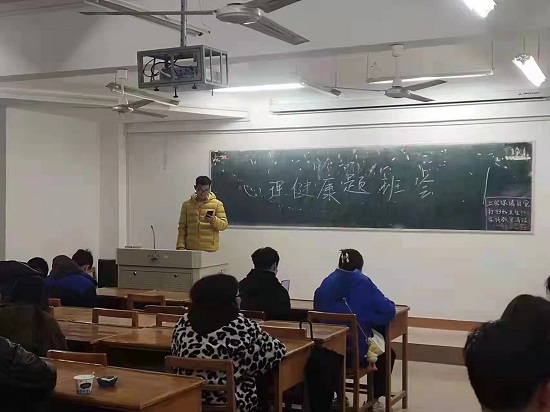 班会上,各班班主任讲到心理健康活动如贫困生心理、大学生恋爱心理、自卑心理、以及青春期心理的成因,增强了学生对不同心理情况的了解,并说到心理健康大多因家庭、情感、思想及心理健康的变化所形成,为此我们应正确看待,承认失败、改正失败、勇于挑战,进行积极的自我暗示,增强自信。在困境中要学会发挥自身优势,悦纳自我,学会自我调试,关心他人,促进共同健康成长,为自己营造良好的学习生活氛围,从而更好的展现自我魅力。
