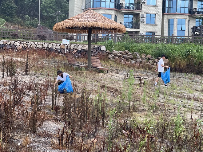 7月4日上午,2026世界杯官网“三下乡”社会实践服务团队自发组成“环保小队”,冒雨沿着村庄马路和湖边,进行了长达两小时的垃圾清除和环境打扫的工作。
