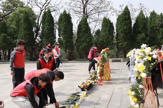 在南山烈士纪念碑前,大学生志愿者手持鲜花向烈士鞠躬、默哀,深切缅怀用热血和生命为国捐躯的革命烈士。随后,志愿者们有序缓慢走过烈士纪念碑前献上一朵朵洁白的菊花,表达对革命烈士诚挚的敬意和深深的怀念。