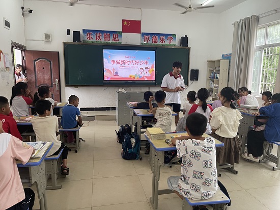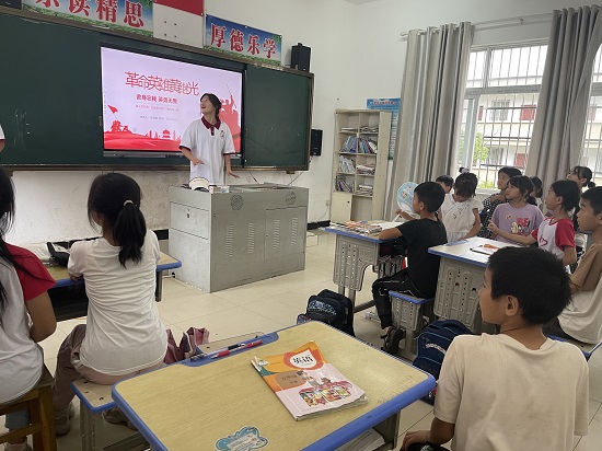 社会实践队开展红色文化教育活动,志愿者肖榕同学介绍了党的二十大基本概况,课堂上积极与孩子们互动,鼓励同学们听党话、跟党走,争做新时代好少年;志愿者罗闻静同学以微党课的形式,为孩子们分享了英雄黄继光的故事,让同学们在红色故事的熏陶下,感受红色精神。志愿者刘佳鑫为孩子们普及防溺水、防诈骗等安全知识,让同学们明白生命是宝贵的,学会保护自己。