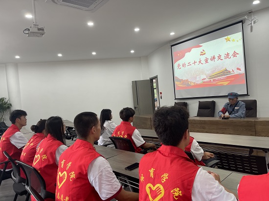 随后,实践队来到金盘村村支部开展党的二十大精神宣讲交流,并聆听烈士后代辛结生讲述其爷爷——烈士辛忠荩在岷山根据地组织赣北人民抗日游击武装的英勇事迹,同时围绕学习贯彻党的二十大精神和同学们进行了深入的交流与探讨,并给同学们提出了宝贵的人生经验和建议,勉励当代青年学史爱党,报效祖国。