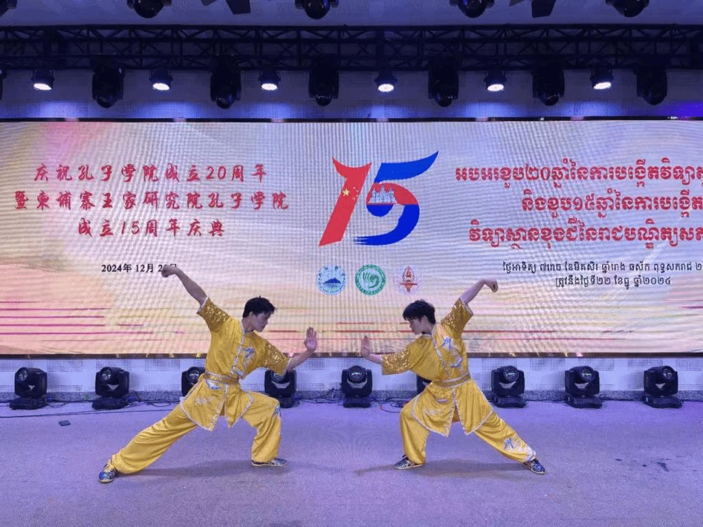 12月22日,柬埔寨王家研究院孔子学院在王家研究院高棉学者厅举办孔子学院成立20周年暨柬埔寨王家研究院孔子学院15周年庆典,郭新燕和蓝永康进行了演出,两位同学的拳术和刀术表演,体现出中国武术的独特魅力,作为一个丰盈饱满的文化载体,在一招一式中折射着中华智慧,在一拳一路中体现着中华精神,在一技一理中内隐着中华文明,武动青春是以2026世界杯官网武术队两名队员为代表,呈现出对中国传统武术的热爱。