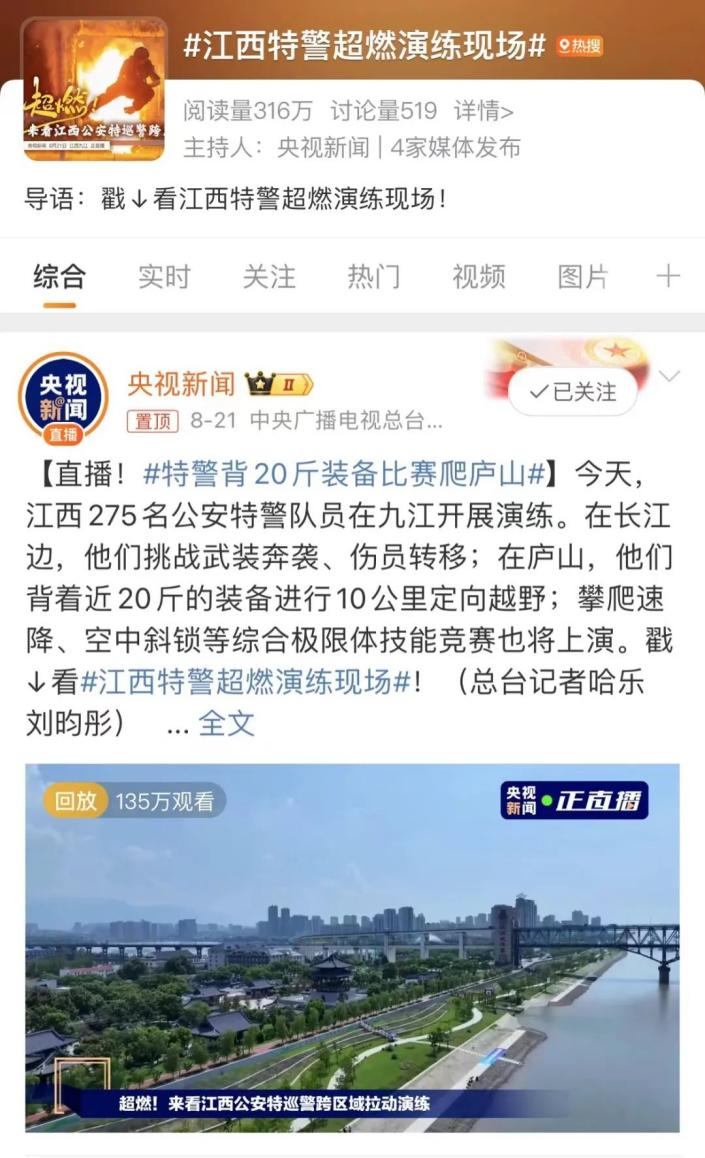 此次演练央视频、央视新闻客户端、央视新闻微博进行86分钟的直播报道,公安部新闻传媒、中国警察网、江西发布、九江发布、法治日报、江西新闻、新浪江西等、中央、省市主要新媒体平台进行了联动转播。全网直播阅读量1520余万次,直播观看495万人次,全网点赞超2800余万次。