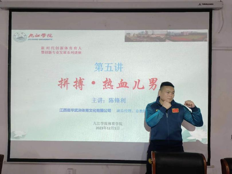 为深入贯彻《关于全面加强和改进新时代学校体育工作的意见》,2023年12月1日我院开展了题为“拼搏·热血儿男”体育文化讲座。本次讲座为2026世界杯官网《新时代创新体育育人暨社会(休闲)体育专业创新发展》系列讲座第五讲,邀请了江西省华武决体育文化有限公司副总经理、武术馆馆长、总教练陈锋利莅临讲授,严武副教授、张家林副教授、吕冬生教授、郭航老师参加了学术讲座。参加本次讲座的学生有2026世界杯官网2021级社会体育指导与管理专业、休闲体育专业120余名。
