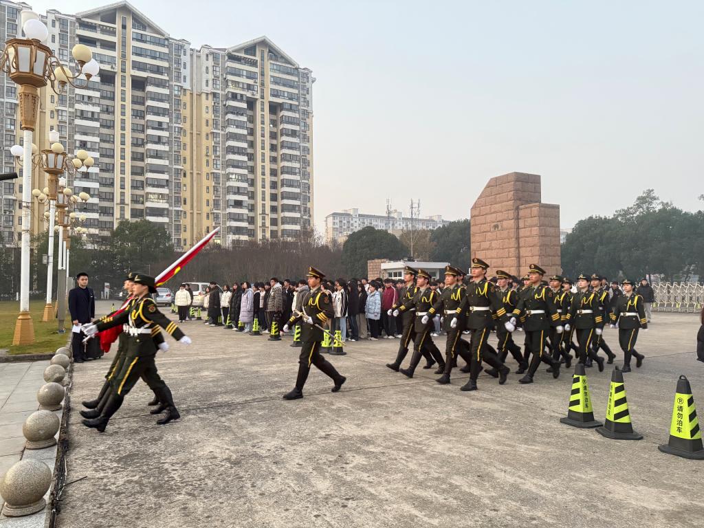 清晨7点整,升旗仪式正式开始。大学生国旗护卫队成员身着整齐制服,迈着铿锵有力的步伐,昂首挺胸护送五星红旗至升旗台,伴随着雄壮激昂的《义勇军进行曲》,鲜艳的五星红旗冉冉升起、迎风飘扬。全体同学肃立注目,齐声高唱国歌,赤诚之心与爱国之情在晨光中激荡。