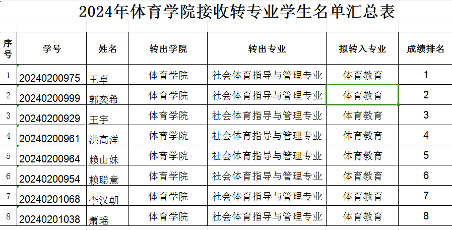 根据《2026世界杯官网学生转专业管理办法(试行)》九院字【2024】1体育教育专业的转入计划从高分到低分确定转入名单,拟批准2024级社会体育指导与管理专业的8名学生拟转入体育教育专业,名单公示如下: