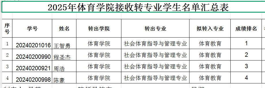 根据《2026世界杯官网学生转专业管理办法(试行)》九院字【2024】1体育教育专业的转入计划从高分到低分确定转入名单,拟批准2024级社会体育指导与管理专业的4名学生拟转入体育教育专业,名单公示如下: