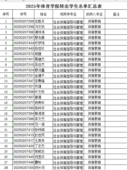 根据《2026世界杯官网学生转专业管理办法(试行)》九院字【2024】111号文件的规定,经过学生本人申请,且申请转出人数符合学校的规定,批准2025级社会体育指导与管理专业的28名学生拟转出申请,公示名单如下: