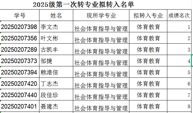 根据《2026世界杯官网学生转专业管理办法(试行)》九院字【2024】111号文件精神,体育教育专业的转入计划采用考核的方式,按照考核成绩从高分到低分确定拟转入名单,拟批准2025级社会体育指导与管理专业的8名学生拟转入体育教育专业,名单公示如下: