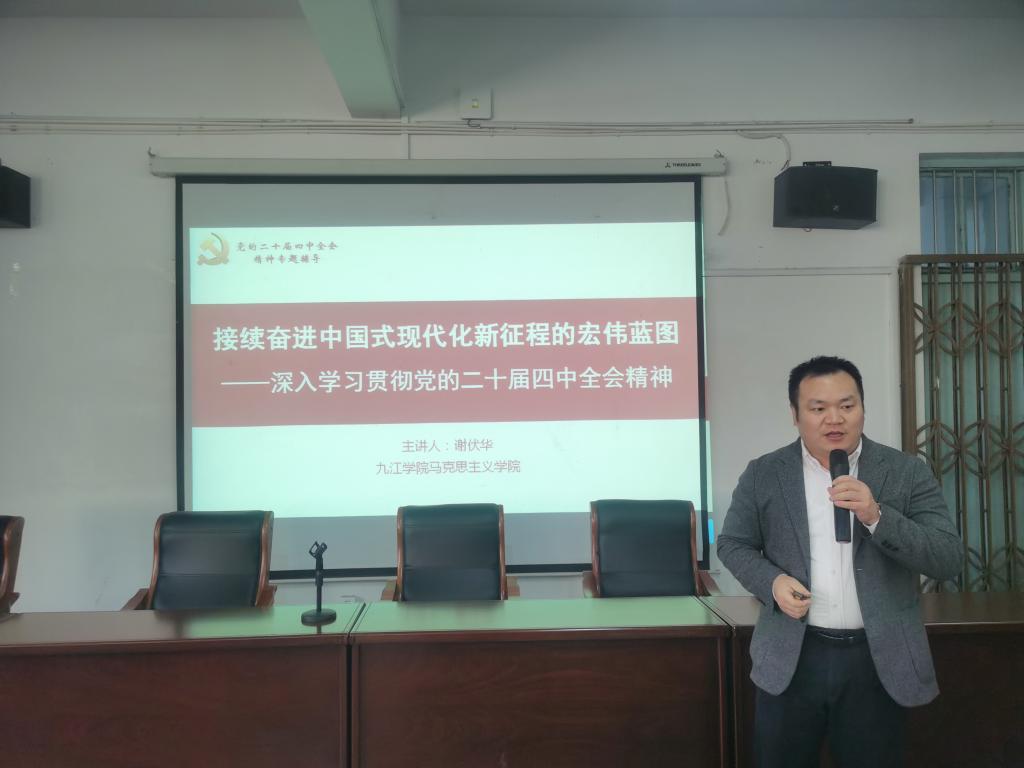 报告会上,谢伏华老师以《接续奋进中国式现代化新征程的宏伟蓝图——深入学习贯彻党的二十届四中全会精神》为题,分别从深刻领会党的二十届四中全会的重大意义、全面贯彻中国式现代化的“十五五”战略部署、奋力实现“十五五”规划宏伟蓝图的美好愿景等三个方面对党的二十届四中全会精神作了深入阐述和具体解读。