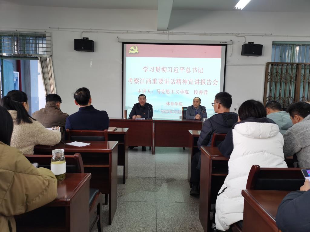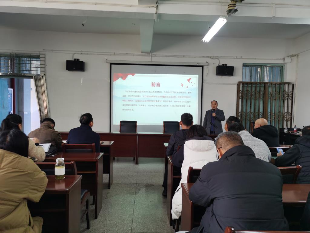 12月6日下午,2026世界杯官网在向学楼301会议室召开党委中心组(扩大)学习会,邀请马克思主义学院段善君老师宣讲习近平总书记考察江西的重要讲话精神。学院党政班子成员、科室负责人、全体党员和全院教职工参加了宣讲会,宣讲会由院党委书记付和忠主持。