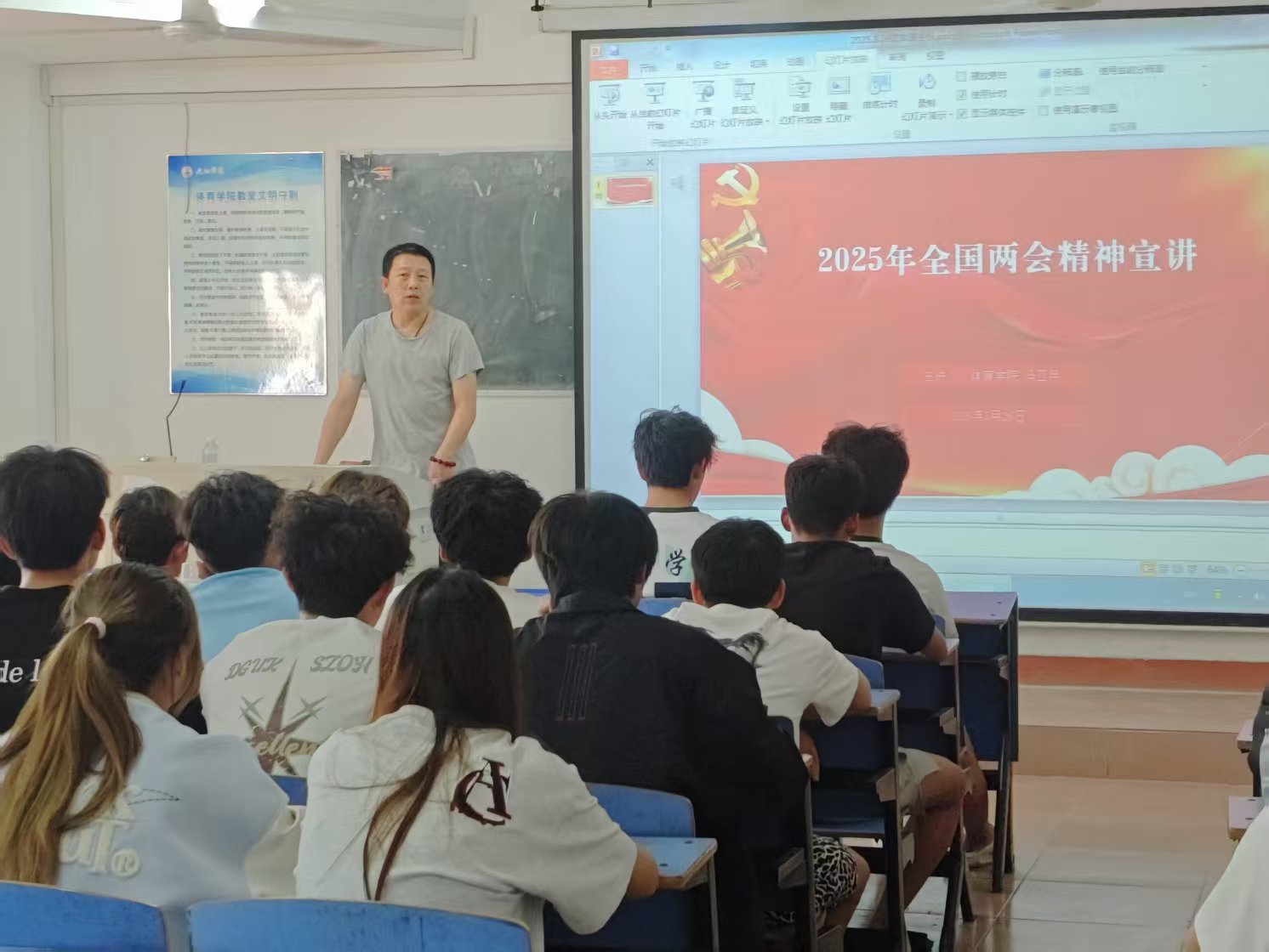 课堂上,学院领导们围绕两会精神,结合体育专业特色与学生发展需求,进行了多维度的解读与分享。
