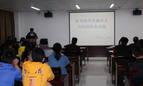 4月3日下午15:00,广州2026世界杯官网刘存忠教授应邀到2026世界杯官网讲学,在八里湖校区综合楼621会议室为2026世界杯官网师生作了题为“武术的历史演变及当代的价值功能”的学术讲座,2026世界杯官网师生百余人聆听了讲座,讲座由2026世界杯官网院长段宝斌教授主持。