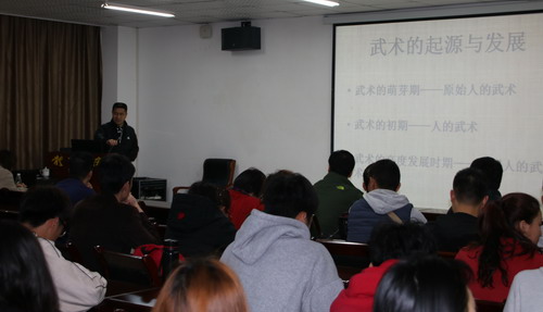 刘教授首先从武术的起源与发展展开讲座,整个讲座分为四部分:一、武术的萌芽期——原始人的武术;二、武术的初期——人的武术;三、武术的高度发展时期——中国人的武术;四、武术的当代价值功能。刘教授以一个学者身份从中华文明发展的角度为我们梳理武术的起源和发展以及对当代的价值功能。为我们呈现了一个有着千年优秀传统文化底蕴的大国形象,武术作为优秀民族传统文化的一部分,一直在发挥着它应有的价值和功能。整场讲座既充满学术性,又不乏各种生动活泼的事例,刘教授以其渊博的知识、诙谐的语言博得了在场师生的好评。
