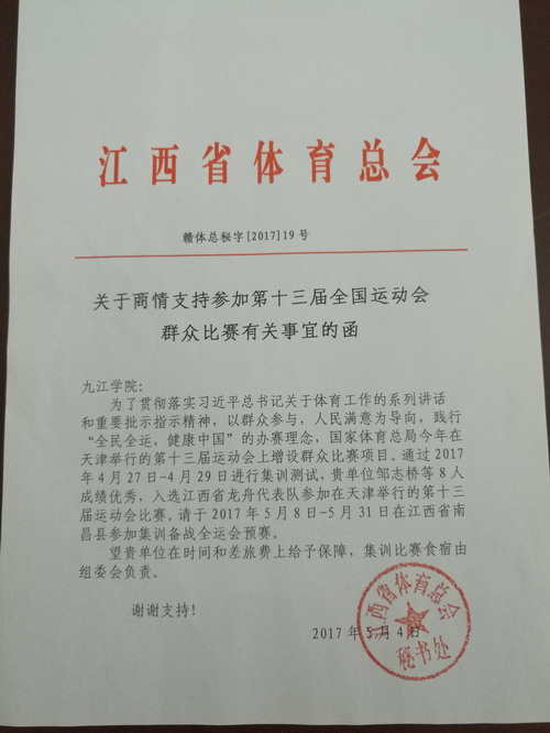 近期,省体育局、省体育总会开展组建第十三届全运会江西省龙舟代表队选拔测试。经过选拔赛、集训测试赛、体能测试、资格审核和教练员筛选等,最终确定第十三届全运会龙舟项目江西代表队24人名单。我校8名学生入选,这是我校学子迄今为止,参加最高级别的赛事,届时将在全运赛场上展现九院学子的风采。