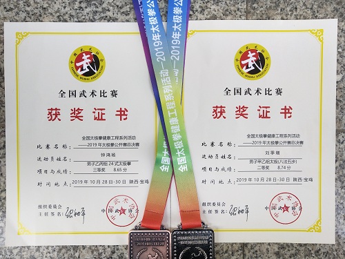 10月30日,由国家体育总局武术运动管理中心主办的2019年全国太极拳公开赛总决赛在陕西省宝鸡市落下帷幕,我校两名学生在比赛中表现优秀,荣获二等奖和三等奖的好成绩。