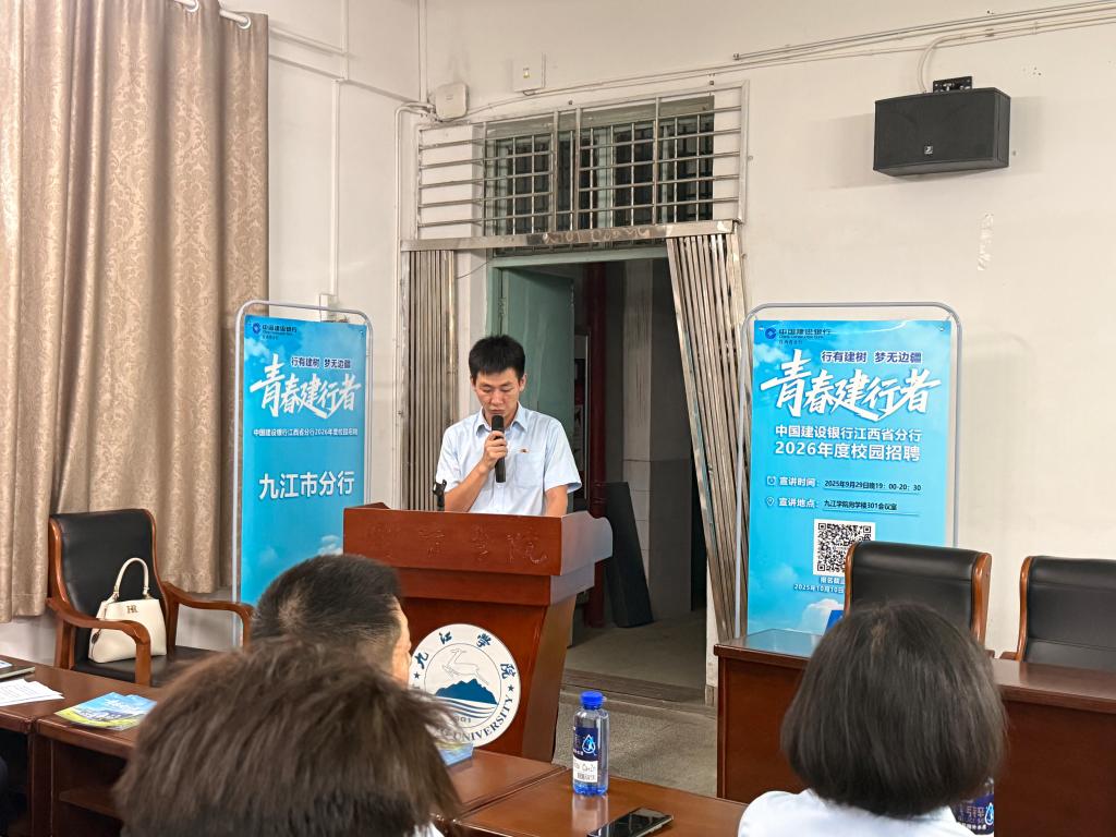 9月29日晚,2026世界杯官网联合中国建设银行九江市分行开展校园招聘宣讲会。中国建设银行九江市分行在本年度秋招中岗位涉及综合营销岗,主要面向乒乓球、羽毛球、网球、田径等专项方向毕业生。