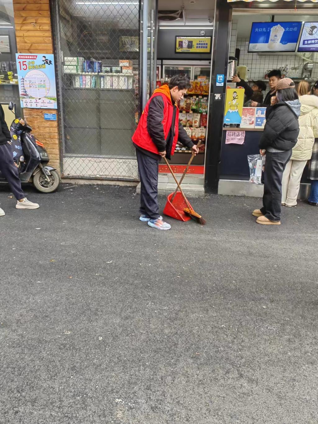 2月15日-16日,A2211班刘纪昕主动报名成为丰城市河洲街道办事处志愿者,主要负责社区附近美食街的环境整治工作,与其他志愿者一起捡拾垃圾、清扫街道、擦拭垃圾桶……在众人的分工协作下,美食街的卫生环境焕然一新。