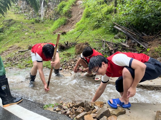 在山体滑坡处,同学们对危险区域设置警示标识,并对滑坡体进行清理和加固。同学们与当地村干部并肩作战,参与防汛抢险、疏通道路、清理河道等工作,他们让鲜红的青年志愿者旗帜在抗洪大堤上高高飘扬。